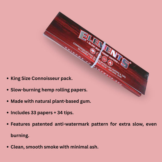 Elements Red Connoisseur Hemp Rolling Paper | King Size Slim With Tips