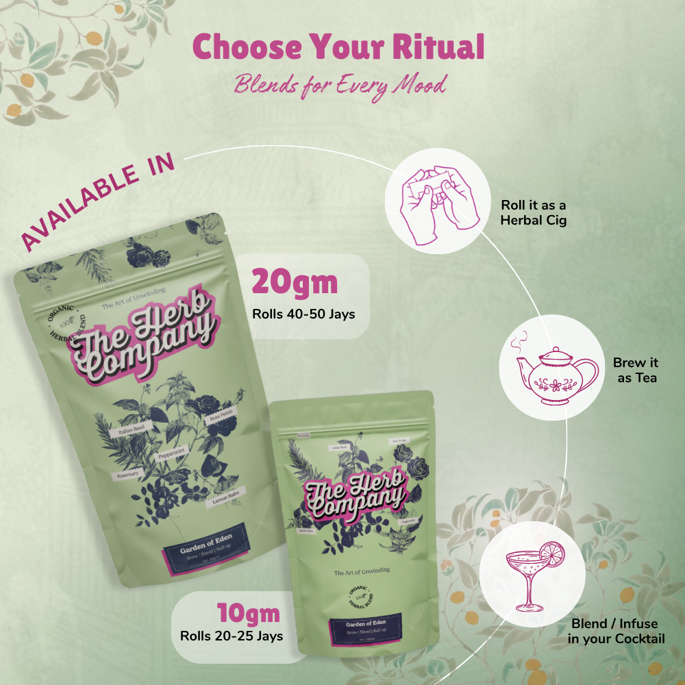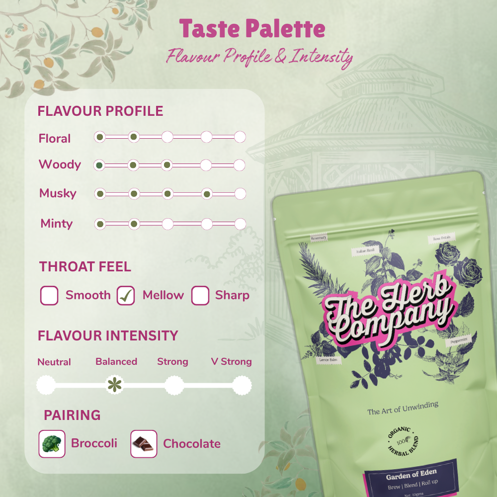 The Herb Company's Garden of Eden blend offers a calming, refreshing, and deeply satisfying smoking experience. It's the perfect companion to relax your mind and enjoy a healthier alternative to tobacco.